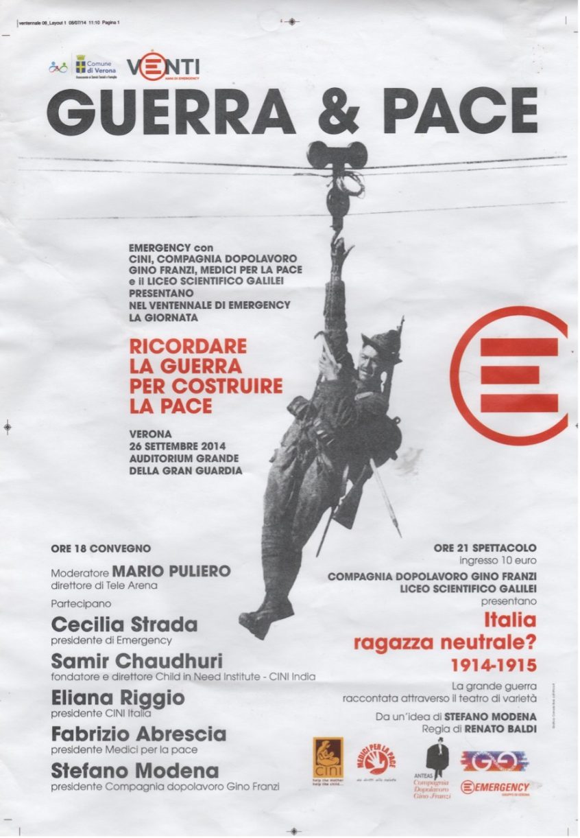 Guerra e PaceAuditorium della Gran Guardia. Verona, 26 settembre 2014 “Ricordare la guerra per costruire la pace” Convegno in collaborazione con Emergency, Cini, Medici per la pace. Spettacolo “Italia, ragazza neutrale?”