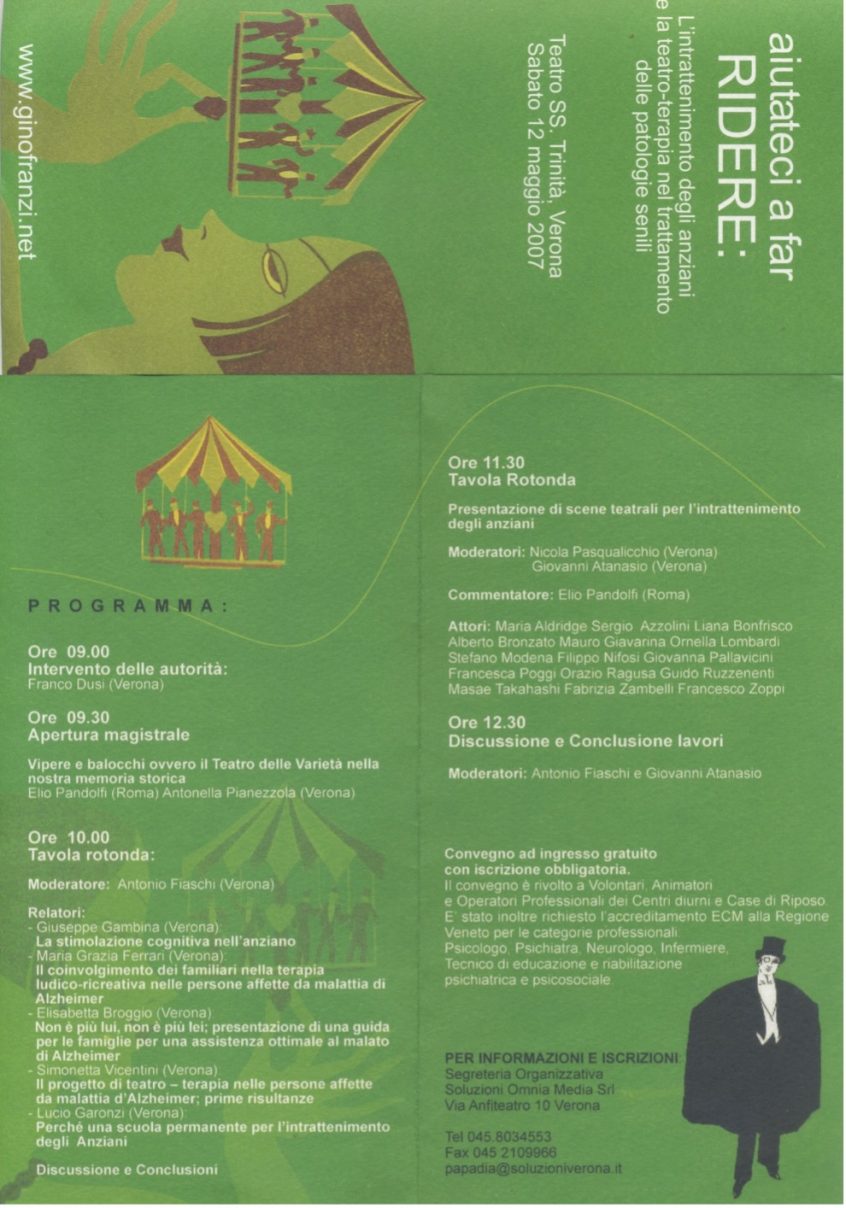 Aiutateci a far ridere. Teatro di SS Trinità. Verona, 12 maggio 2007 Convegno L’intrattenimento degli anziani e la teatro-terapia nel trattamento delle patologia senili. Intrattenimento teatrale