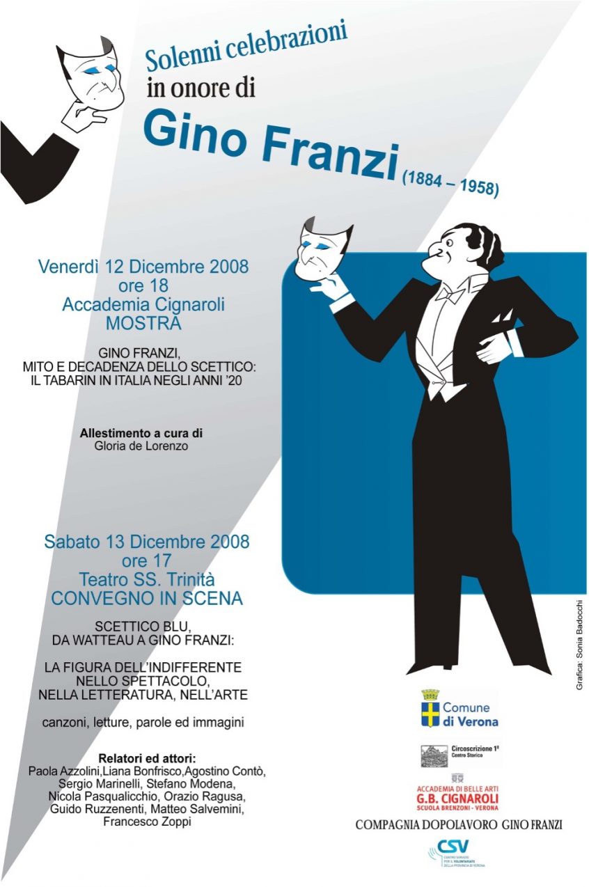 Solenni celebrazioni in onore di Gino Franzi.Accademia Cignaroli. Verona, 12 dicembre 2008 Mostra. Gino Franzi. Mito e decadenza dello scettico: Il tabarin in Italia negli anni ’20. Teatro di SS. Trinità. Verona, 13 dicembre 2008 Convegno in scena Scettico Blu. Da Watteau a Gino Franzi, la figura dell’indifferente nello spettacolo, nella letteratura, nell’arte